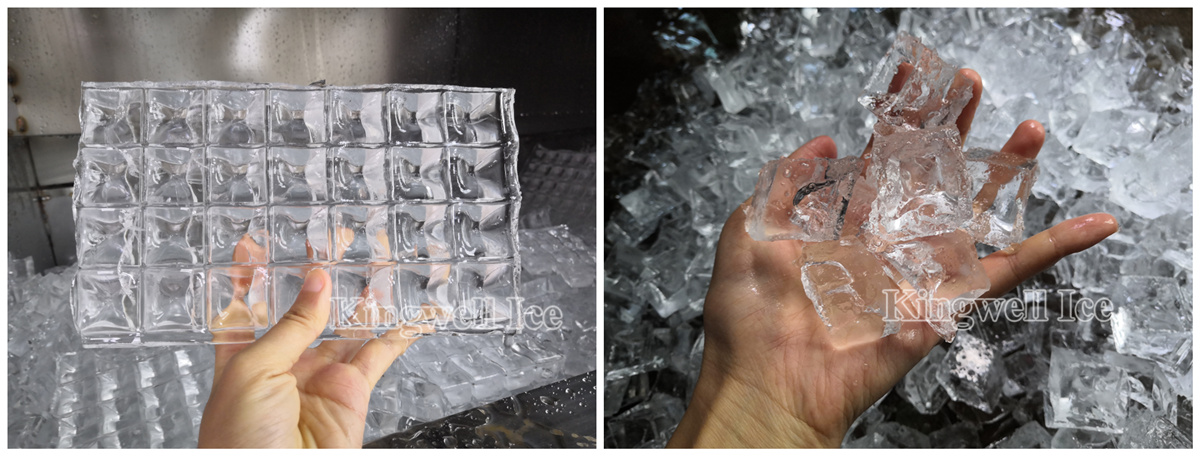 Kingwell KW-C5 cube ice machine can produce 5 tons cube ice in 24 hours (We’ll call this machine in short of KW-C5), the ice is bright crystal, clean and beautiful cube ice. In order to meet different requirements of customers all around the world, we make two different sizes of cube ice: 22X22X22mm or 29X29X22mm.